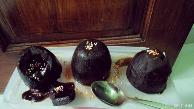 Lalu lakukan tes kematangan menggunakan tusuk gigi atau lidi.Jika sudah matang, segera lepaskan kue dari cetakan, lalu taburi dengan sprinkle meses. SELAMAT MENIKMATI ^_^Sumber: https://cookpad.com/id/resep/195728-lava-cake-cokelat-kukus-steam-choco-lava-cake