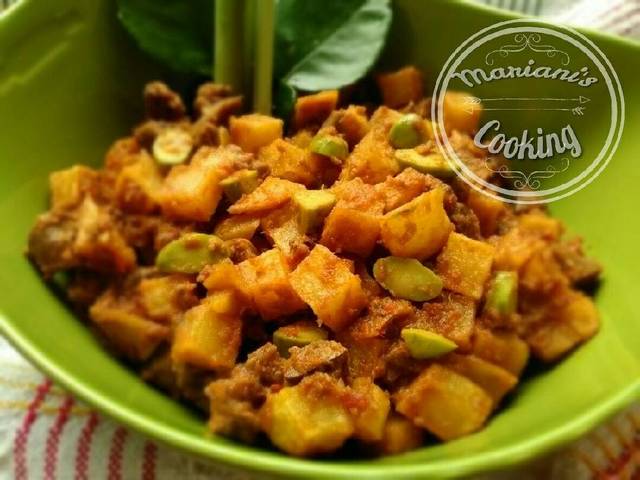 - Tambahkan santan dan petai. Aduk hingga surut (agak kering). Test rasa. Bila kurang tambahkan gula atau garam secukupnya saja.